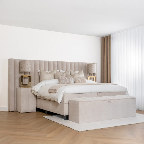 Kiest u voor de uitvoering met hogere pootjes (12 cm), dan ontstaat er meer ruimte onder het bed, waardoor het aanzienlijk eenvoudiger is om onder de boxspring schoon te maken. Deze uitvoering is ideaal voor wie houdt van een stevig liggevoel, een luxe uitstraling én praktisch gemak.