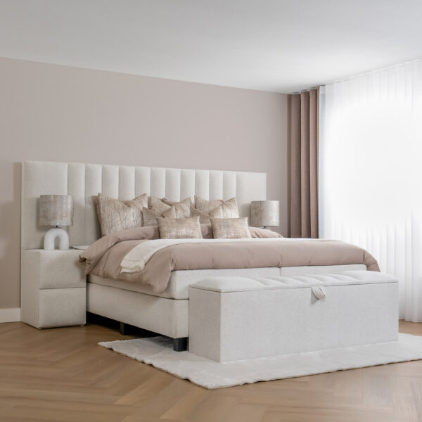 Kiest u voor de uitvoering met hogere pootjes (12 cm), dan ontstaat er meer ruimte onder het bed, waardoor het aanzienlijk eenvoudiger is om onder de boxspring schoon te maken. Deze uitvoering is ideaal voor wie houdt van een stevig liggevoel, een luxe uitstraling én praktisch gemak.