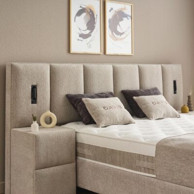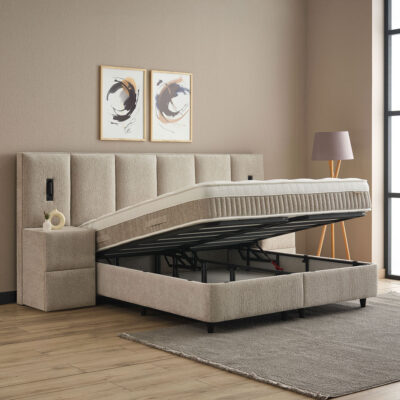 Het opbergbed Davis is een stijlvol en praktisch bed met een luxe hoofdbord en een hoogwaardige afwerking. Het hoofdbord is zacht gestoffeerd en voorzien van twee prachtig geïntegreerde lampen, die zorgen voor extra sfeer en functionaliteit in de slaapkamer. Het zorgvuldig ontworpen hoofdbord geeft het bed een chique en eigentijdse uitstraling.