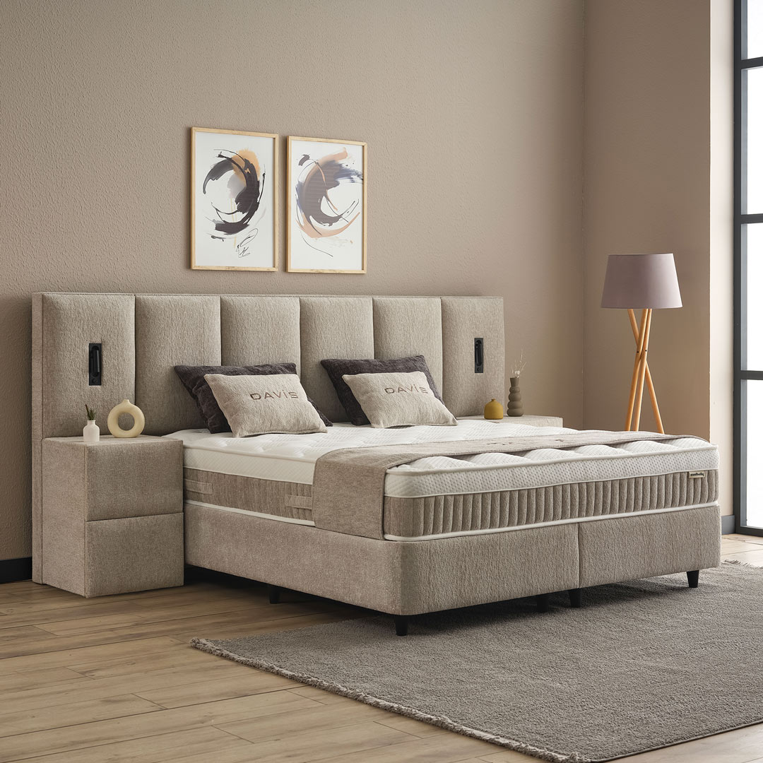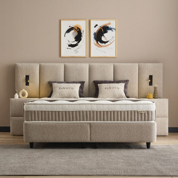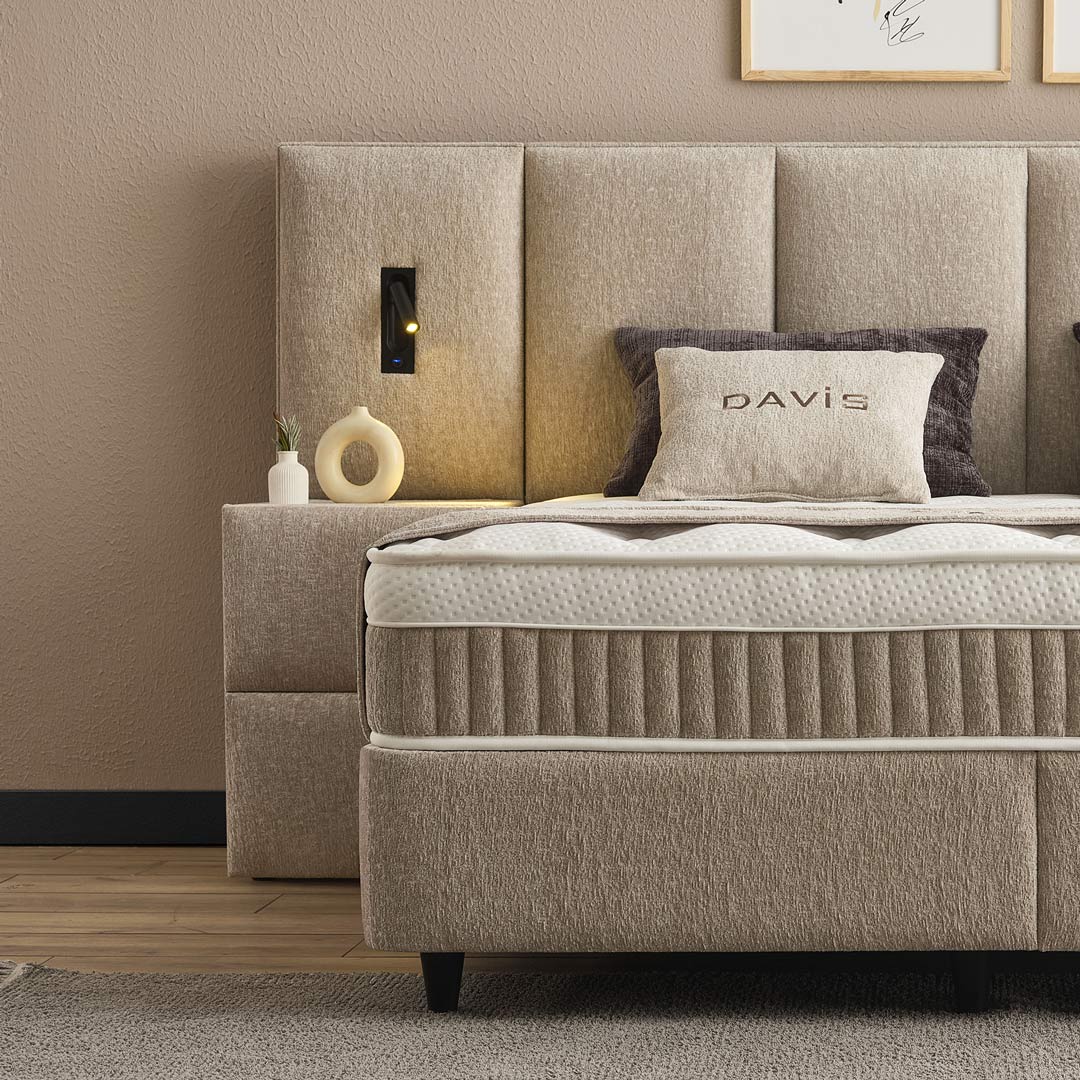 Het opbergbed Davis is een stijlvol en praktisch bed met een luxe hoofdbord en een hoogwaardige afwerking. Het hoofdbord is zacht gestoffeerd en voorzien van twee prachtig geïntegreerde lampen, die zorgen voor extra sfeer en functionaliteit in de slaapkamer. Het zorgvuldig ontworpen hoofdbord geeft het bed een chique en eigentijdse uitstraling.
