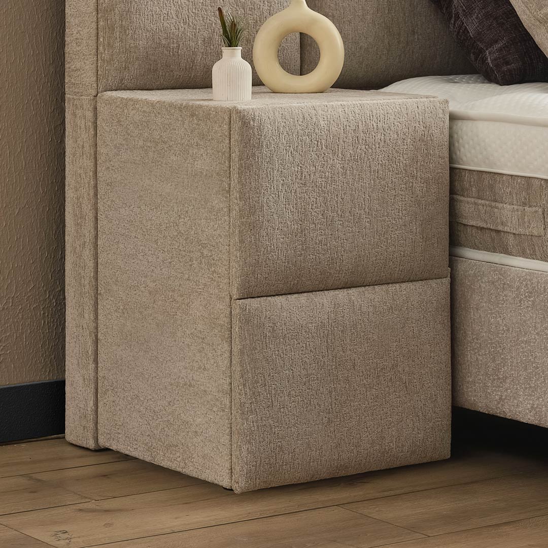 Het gestoffeerde opbergbed Davis van ABC Sleepcenter is voorzien van een elegant en stijlvol hoofdbord dat aan weerszijden van het bed uitsteekt. Het hoofdbord is uitgerust met twee geïntegreerde lampen, die niet alleen zorgen voor extra verlichting, maar ook bijdragen aan de luxe uitstraling van het bed.