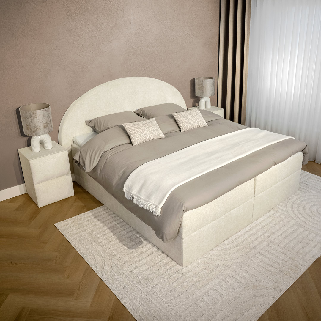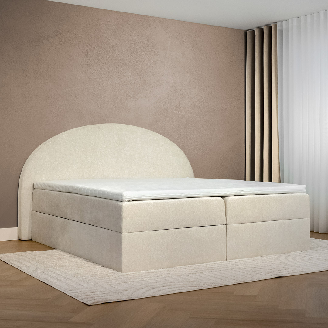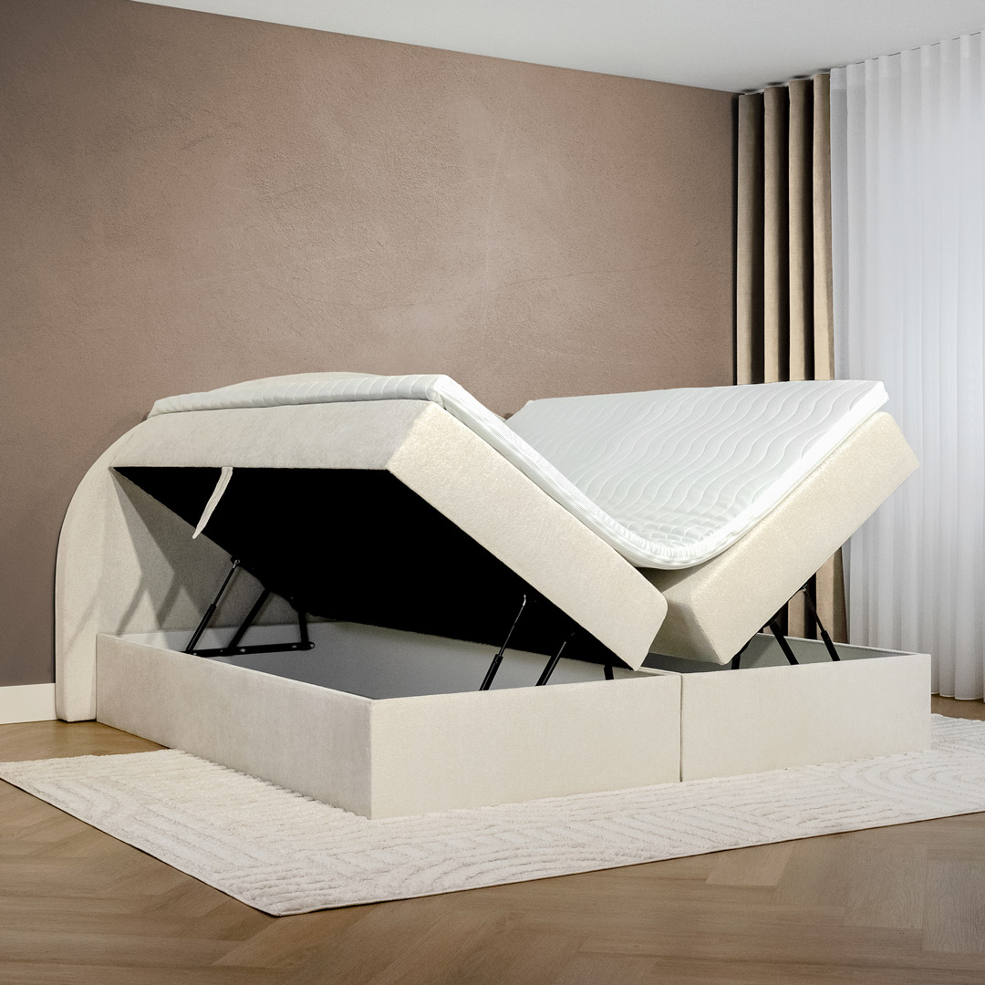 De matrassen zijn stevig bevestigd aan de boxen, waardoor openen en sluiten altijd stabiel en soepel verloopt. Dankzij het krachtige liftsysteem met veerondersteuning open je de boxen moeiteloos. De combinatie van stevig hout en luxe meubelstof zorgt voor een duurzame, stijlvolle en gebruiksvriendelijke constructie.