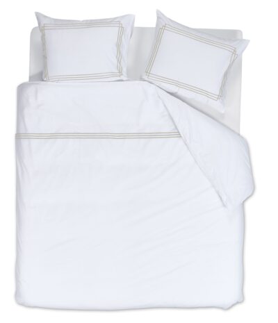 De bijpassende kussenslopen zijn afgewerkt met dubbele zandkleurige kaders, wat zorgt voor een speels en stijlvol contrast binnen het geheel. Hierdoor krijgt het dekbedovertrek een luxe, maar toch tijdloze uitstraling die perfect past in zowel moderne als klassieke interieurs.